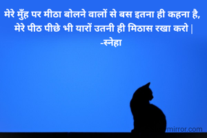 मेरे मुँह पर मीठा बोलने वालों से बस इतना ही कहना है, मेरे पीठ पीछे भी यारों उतनी ही मिठास रखा करो | -स्नेहा