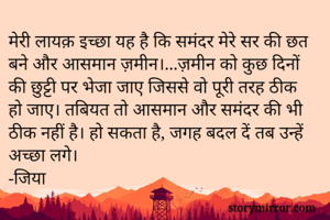 मेरी लायक़ इच्छा यह है कि समंदर मेरे सर की छत बने और आसमान ज़मीन।...ज़मीन को कुछ दिनों की छुट्टी पर भेजा जाए जिससे वो पूरी तरह ठीक हो जाए। तबियत तो आसमान और समंदर की भी ठीक नहीं है। हो सकता है, जगह बदल दें तब उन्हें अच्छा लगे। -जिया