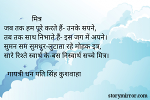 मित्र जब तक हम पूरे करते हैं- उनके सपने, तब तक साथ निभाते हैं- इस जग में अपने। सुमन सम सुमधुर-लुटाता रहे मोहक इत्र, सारे रिश्ते स्वार्थ के-बस निस्वार्थ सच्चे मित्र। गायत्री धन पति सिंह कुशवाहा