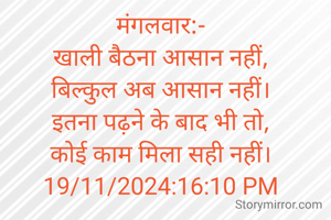 मंगलवार:- खाली बैठना आसान नहीं, बिल्कुल अब आसान नहीं। इतना पढ़ने के बाद भी तो, कोई काम मिला सही नहीं। 19/11/2024:16:10 PM