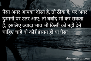 पैसा अगर आपका दोस्त है, तो ठीक है; पर अगर दुश्मनी पर उतर आए; तो बर्बाद भी कर सकता है, इसलिए ज्यादा भाव भी किसी को नहीं देने चाहिए चाहे वो कोई इंसान हो या पैसा।