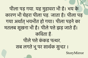 पीला पड़ गया, यह मुहावरा भी है। भय के कारण भी चेहरा पीला पड़. जाता है। पीला पड़ गया अर्थात् भयभीत हो गया। पीला पड़ने का मतलब सूखना भी है। पीले पत्ते झड़ जाते हैं। कविता है- पीले पत्ते कंकड पत्थर, सब लगते भू पर सार्थक सुन्दर ।