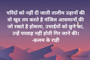 परिंदों को नहीं दी जाती तालीम उड़ानों की वो खुद तय करते है मंजिल आसमानों की जो रखते है होसला, उचाईयों को छुने का, उन्हें परवाह नहीं होती गिर जाने की। -क़लम के राही