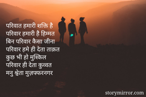 परिवात हमारी शक्ति है परिवार हमारी है हिम्मत बिन परिवार कैसा जीना परिवार हमे ही देता ताक़त कुछ भी हो मुश्किल परिवार ही देता कुव्वत मनु श्वेता मुज़फ्फरनगर