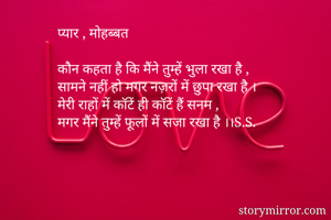 प्यार , मोहब्बत कौन कहता है कि मैंने तुम्हें भुला रखा है , सामने नहीं हो मगर नज़रों में छुपा रखा है । मेरी राहों में कॉटें ही कॉटें हैं सनम , मगर मैंने तुम्हें फूलों में सजा रखा है ।।S.S.