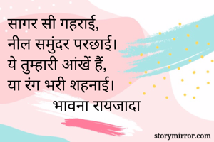 सागर सी गहराई, नील समुंदर परछाई। ये तुम्हारी आंखें हैं, या रंग भरी शहनाई। भावना रायजादा