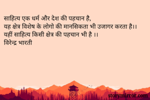 साहित्य एक धर्म और देश की पहचान है, यह क्षेत्र विशेष के लोगो की मानसिकता भी उजागर करता है।। यहीं साहित्य किसी क्षेत्र की पहचान भी है ।। विरेन्द्र भारती