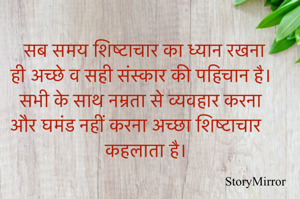 सब समय शिष्टाचार का ध्यान रखना ही अच्छे व सही संस्कार की पहिचान है। सभी के साथ नम्रता से व्यवहार करना और घमंड नहीं करना अच्छा शिष्टाचार कहलाता है।