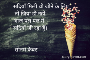 सदियाँ मिलीं थी जीने के लिए तो जिया ही नहीं आज पल पल में सदियाँ जी रहा हूँ। सोनम केवट