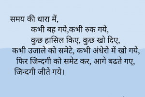 समय की धारा में, कभी बह गये,कभी रुक गये, कुछ हासिल किए, कुछ खो दिए, कभी उजाले को समेटे, कभी अंधेरो में खो गये, फिर जिन्दगी को समेट कर, आगे बढते गए, जिन्दगी जीते गये।