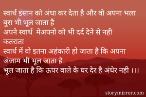 स्वार्थ इंसान को अंधा कर देता है और वो अपना भला बुरा भी भूल जाता है अपने स्वार्थ मेअपनो को भी दर्द देने से नही कतराता स्वार्थ में वो इतना अहंकारी हो जाता है कि अपना अंजाम भी भूल जाता है भूल जाता है कि ऊपर वाले के घर देर है अंधेर नही ।।।