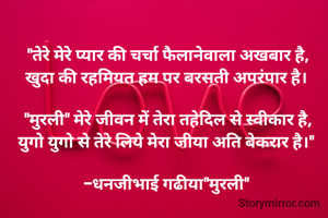 "तेरे मेरे प्यार की चर्चा फैलानेवाला अखबार है, खुदा की रहमियत हम पर बरसती अपरंपार है। "मुरली" मेरे जीवन में तेरा तहेदिल से स्वीकार है, युगो युगो से तेरे लिये मेरा जीया अति बेकरार है।" -धनजीभाई गढीया"मुरली"