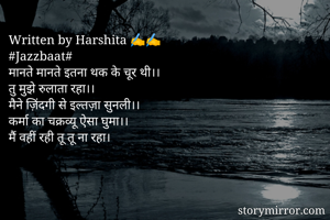 Written by Harshita ✍️✍️ #Jazzbaat# मानते मानते इतना थक के चूर थी।। तु मुझे रुलाता रहा।। मैने ज़िंदगी से इल्तज़ा सुनली।। कर्मा का चक्रव्यू ऐसा घुमा।। मैं वहीं रही तू तू ना रहा।