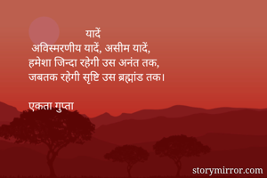 यादें अविस्मरणीय यादें, असीम यादें, हमेशा जिन्दा रहेगी उस अनंत तक, जबतक रहेगी सृष्टि उस ब्रह्मांड तक। एकता गुप्ता