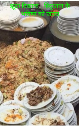 लोग आते जा रहे थे और अलग अलग स्टालों से उनकी पसंद के व्यंजन उठा रहे थे। जो पसंद आ रहा था वह खा रहे थे और जो पसंद नहीं आ रहा था वो कूड़ेदान में फेंकते जा रहे थे। फिर वे दूसरे स्टॉल पर जा रहे थे और वहां पर भी वे उसी तरह से कर रहे थे जैसा पहले वाले स्टालों पे वे कर चुके थे।कुछ बुज़ुर्ग लोग सीधा खाने के स्टॉल पर जा रहे थे और अपनी पसंद का जितना चाहिए उतना ही खाना थाली में उठा रहे थे। अंत में वे स्टेज पर जा रहे थे लड़के लड़की को आशीर्वाद देने। इस तरह से करते करते धीरे धीरे भीड़ कम होना चालू हुई और अंत में सिर्फ लड़के और लड़की के रिश्तेदार ही बच गए। सब लोगों ने मिलकर खाना खाया उसके बावजूद भी वहां पर बहुत सारा खाना बच गया। वहां पर लड़की वालों की तरफ से एक रिश्तेदार आया था जो कि एक लेखक था, उससे आखिर रहा नहीं गया और उसने कहा, "आखिर इतना सारा खाना और इतनी सारी चीज़ें बनवाने की ज़रूरत क्या है? लोग खाना कितना व्यर्थ गंवाते हैं। जितना वो उठाते हैं उसका आधा भी नहीं खाते हैं, शेष तो सारा कूड़ेदान में ही फेंक देते हैं। यहां पर हमारे हिंदुस्तान में ऐसे कई घर हैं जिनके घरों में कई दिनों तक चूल्हा नहीं जलता है और यहां शादी के मौकों पर इतना खाना व्यर्थ जाता है। ज़रा सोचो किसान किस तरह से कड़ी धूप में, बारिश में और सर्दी में हर मौसम में कितनी मेहनत करके अनाज पैदा करता है पर उसकी मेहनत को लोग यूं ही झूठे दिखावे की खातिर बेकार गंवाते हैं। माना कि शादी ब्याह एक खुशी का मौका है पर इस तरह से किसी भी चीज़ का अपव्यय करना अच्छी बात नहीं है। लोग खा खा कर आखिर कितना खायेंगे? जितना पेट है उतना ही खायेंगे न, वो तो कम चीज़ों से भी भर सकता है, उसके लिए इतनी सारी चीज़ें बनवाने की क्या ज़रूरत है? इतनी चीज़ें बनवाकर हम क्या सिद्ध करना चाहते हैं कि हम किसी से कम नहीं हैं! क्यों हम झूठे दिखावे के पीछे पड़े हैं?क्या हम अपने घरों में भी इतना खाना बनवाते हैं या इतने खाने को बाहर फैंकते हैं? ये सिर्फ इस शादी की बात नहीं है पर हर शादी में ऐसा होता है। ज़रा अपने हिंदुस्तान और उसके भविष्य के बारे में सोचो। अगर ऐसा ही चलता रहा तो एक दिन हम दाने दाने के लिए मोहताज हो जाएंगे। क्या ये सब आपको मंजूर है?" वहां उपस्थित सारे लोगों के सिर नीचे हो गए। तब उसने फिर से सवाल किया,। " अब जो खाना बचा है उसका क्या करोगे? " तो किसी ने कहा कि और क्या करेंगे। यहीं छोड़ जायेंगे या बाहर फैंक देंगे और क्या?" तब उसी लेखक ने कहा, "ये दूसरी गलती जो हम लोग करते हैं। खाना फैंकने से तो अच्छा है किसी को दान किया जाए। यहां पर पास में कोई तो बस्ती होगी न जहां पर गरीब लोग रहते होंगे। जिनके घरों में आज रात का चूल्हा नहीं जला होगा और भूख के मारे उनके बच्चों को नींद नहीं आ रही होगी।" इस पर किसी ने कहा, " हां, 