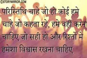 ✍ परिस्थिति चाहे जैसी भी हो कोई हमें चाहे जो कहता रहे हमें वही करना चाहिए जो सही हो और रिस्तो में हमेशा विश्वाश रखना चाहिए..!!