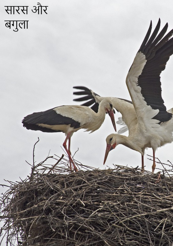 सारस अकेला खड़ा है खेत में, इधर-उधर देख रहा है, सिर हिलाता है और सोचता है : “मुझे अब घर बसा लेना चाहिए, घोसला बनाना चाहिए और घरवाली लाना चाहिए”।