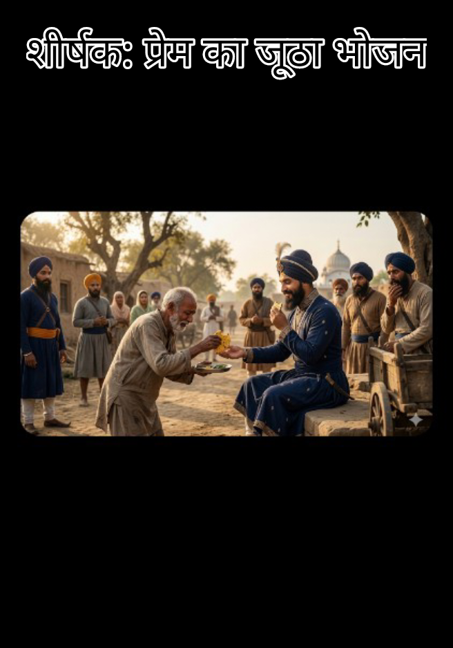 शीर्षक: प्रेम का जूठा भोजन एक बार श्री गुरु गोबिंद सिंह जी शिकार से लौट रहे थे। रास्ते में उन्हें एक बहुत ही गरीब और पिछड़ी जाति का सिख मिला। वह गुरु जी का बहुत बड़ा प्रेमी था। जैसे ही उसने गुरु जी को देखा, वह खुशी से झूम उठा। उसके पास गुरु जी को खिलाने के लिए कुछ खास नहीं था, बस एक मक्की की रोटी और थोड़ा सा साग था, जो वह खुद खा रहा था। प्रेम के वश में होकर, उसने अपनी आधी खाई हुई रोटी का टुकड़ा बड़े चाव से गुरु जी की ओर बढ़ा दिया। गुरु साहिब, जो शहंशाहों के शहंशाह थे, उन्होंने बिना किसी संकोच के उस गरीब सिख के हाथ से वह जूठी रोटी ले ली और बड़े स्वाद से खाई। पास खड़े ऊँची जाति के कुछ सिखों को यह अच्छा नहीं लगा। उन्होंने कहा, "महाराज, आप तो गुरु हैं, आपने एक छोटी जाति के सिख का जूठा भोजन क्यों खाया?" गुरु जी ने मुस्कुराकर जवाब दिया, "सिक्खों, तुमने सिर्फ 'जूठ' देखी है, लेकिन मैंने इसमें भरा हुआ 'प्रेम' देखा है। जो स्वाद मुझे इस प्रेम भरी सूखी रोटी में आया है, वह राजसी पकवानों में भी नहीं है। मेरे दरबार में कोई छोटा या बड़ा नहीं है, यहाँ सिर्फ प्रेम की कद्र है।" यह घटना बताती है कि गुरु साहिब ने कैसे समाज की रूढ़ियों को तोड़कर सबको गले लगाया था।