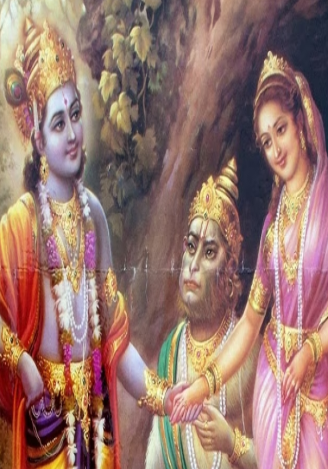 भगवान मन ही मन मुस्कुराने लगे। हनुमान ने हाथ जोड़ते हुए श्रीराम से प्रश्न किया- "हे प्रभु! आज आपने माता सीता के स्थान पर किस दासी को इतना सम्मान दे दिया कि वह आपके साथ सिंहासन पर विराजमान है? "