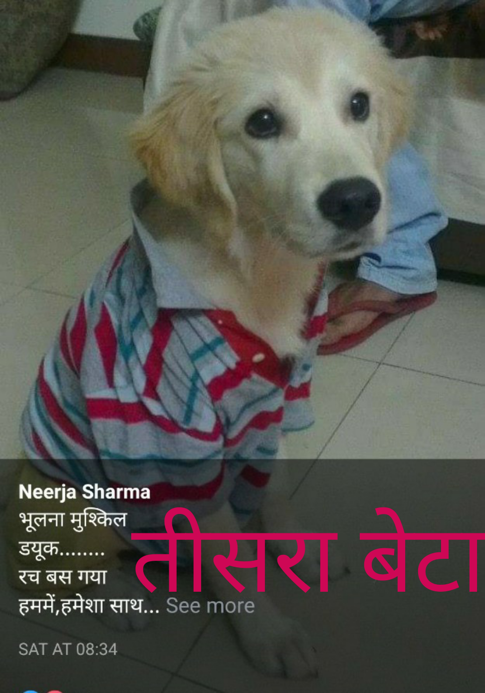 डयूक, मेरा तीसरा बेटा, भूलता नहीं है। उसका वह छोटा सा चेहरा जब मेरा बेटा उसे हमारे घर लेकर आया था। 30 दिन का छोटा सा गोल्डन रिट्रीवर, रुई के जैसे सफेद बहुत ही प्यारा। हैरानी यह थी कि यह कैसे रहेगा अपनी माँ के बिना। लेकिन उसी दिन से ही मुझे एक बार भी ऐसा नहीं लगा कि वह उदास है । एक तो पागलपन की हद तक प्यार करने वाला मेरा छोटा बेटा और उसी का दूसरा रूप डयूक। हर जगह हर वक्त गोदी में चढ़े रहना। बस सोना तो उसके साथ, खाना है तो उसके सामने बैठ के, सब काम उसी के साथ। डयूक पूरी तरह से वेजिटेरियन था। 1 साल का हुआ तो जब उसका बर्थडे मनाया गया तो मैंने उसे बेटे की एक टी-शर्ट पहनाई और सिर पर हाथ लगाया। बेटा उसे ले जाकर शीशे के सामने खड़ा हो गया उसका वह चेहरा देखने लायक था। बहुत ही प्यारा और ऐसे लग रहा था जैसे वह अपने आप को इस रुप में देखकर खुश है कि वह बेटे जैसा लग रहा है।