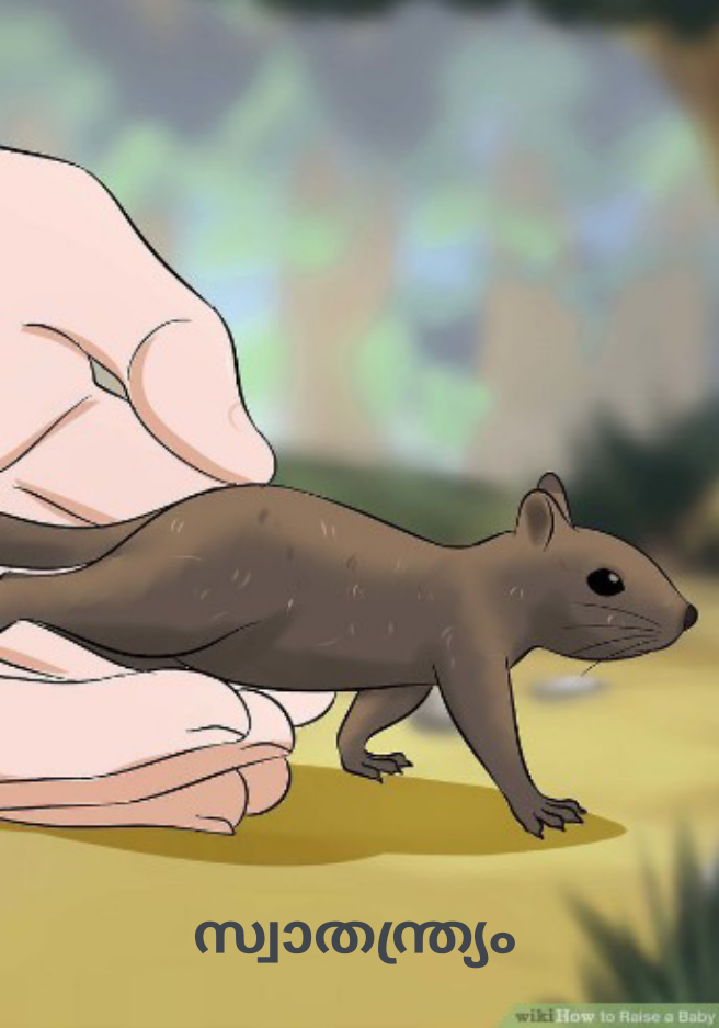 അമ്മ പുഞ്ചിരിയോടെ തുടർന്നു:"അതെ. അതേപോലെ തന്നെയാ ഈ അണ്ണാൻകുഞ്ഞും. അതിൻ്റെ അമ്മ കൊടുക്കുന്ന ഭക്ഷണമേ അതും കഴിക്കൂ... നിങ്ങൾ ഇതിനെ കൂട്ടിലിട്ട് എന്തുകൊടുത്താലും ഇത് കഴിക്കില്ല. നിങ്ങളെ ആരെങ്കിലും മുറിയിലിട്ടു പൂട്ടിയാൽ നിങ്ങളും കരയും, ഞങ്ങളും കരയും. നിങ്ങളെ കാണാതെ ഞങ്ങൾക്ക് വിഷമം ഉണ്ടാകുന്നതുപോലെ, ഞങ്ങളെ കാണാതെ നിങ്ങൾക്ക് വിഷമം ഉണ്ടാകുന്നതുപോലെ, ഇവർക്കും വിഷമം ഉണ്ടാവില്ലേ... ഇതിൻ്റെ അമ്മ കൊടുക്കാതെ ഇത് ഭക്ഷണം കഴിക്കില്ല. ഒന്നും കഴിക്കാതെ ഇതിന് എന്തെങ്കിലും പറ്റിയാലോ... നമ്മളെപ്പോലെ അവർക്കും വേണ്ടതാണ് ഫ്രീഡവും സ്നേഹവും ഒക്കെ. അപ്പോ ഇനി എൻ്റെ മക്കള് ആ അണ്ണാൻ വരുമ്പോ ഇതിനെ തുറന്നുവിടണം. മനസ്സിലായോ?" ചെറുപുഞ്ചിരിയോടെ അമ്മ അത് പറഞ്ഞുനിർത്തുമ്പോൾ മക്കളുടെ മുഖത്ത് സങ്കടമായിരുന്നു.