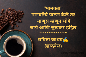 "मानवता" मानवतेचे पालन केले तर माणूस म्हणून सोपे सोपे आणि सुखकर होईल. **************" सविता जाधव✍️ (शब्दवेल)