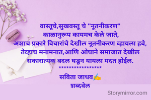 वास्तूचे,सुखवस्तू चे "नूतनीकरण" काळानुरूप कायमच केले जाते, अशाच प्रकारे विचारांचे देखील नूतनीकरण व्हायला हवे, तेव्हाच मनामनात,आणि ओघाने समाजात देखील सकारात्मक बदल घडून यायला मदत होईल. ***************** सविता जाधव✍️ शब्दवेल