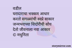 वडील घरादाराचा भक्कम आधार करतो सगळ्यांची स्वप्ने साकार जन्मभराच्या शिदोरीची सोय देतो जीवनाला नवा आकार © मधुनिता