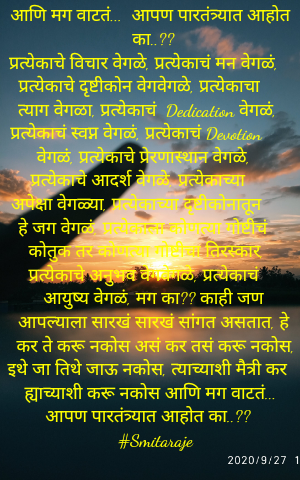 प्रत्येकाचे विचार वेगळे, प्रत्येकाचं मन वेगळं, प्रत्येकाचे दृष्टीकोन वेगवेगळे, प्रत्येकाचा त्याग वेगळा, प्रत्येकाचं डेडिकेशन वेगळं, प्रत्येकाचं स्वप्न वेगळं, प्रत्येकाचं डिवोशन वेगळं, प्रत्येकाचे प्रेरणास्थान वेगळे, प्रत्येकाचे आदर्श वेगळे, प्रत्येकाच्या अपेक्षा वेगळ्या, प्रत्येकाच्या दृष्टीकोनातून हे जग वेगळं, प्रत्येकाला कोणत्या गोष्टीचं कौतुक तर कोणत्या गोष्टीचा तिरस्कार, प्रत्येकाचे अनुभव वेगवेगळे, प्रत्येकाचं आयुष्य वेगळं...