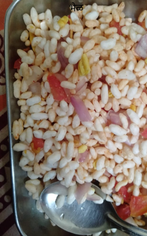 .पण"मुंबई भेळ " या दुकानावर गर्दी अमाप होती .भेळेचाच स्टोल,गर्दी असणारच. भेळ म्हटली की पोटभर जेवल्यावर पण एखादी भेळेची डीश शेअर करावयास हरकत नसते.कारण भेळ पदार्थच अतिशय रुचकर ना ! तोंडाला नुसती चवच नाही पण भूक पण चाळवणारा पदार्थ .खरेच चुरमुरे कुरमुरे त्यातवाफवून कुसकरलेले बटाटे, बारीक चिरलेला टोमेटो ,मैद्याच्या पुरीचे चुरलेले तुकडे ,मीठ ,फरसाण, त्यात चिंचेच्या आंबट गोड चटणीने , मिरची कोथिंबीर पुदिन्याच्या हिरव्या तिखट चटणीच्या पाण्याने सर्व पदार्थाचे नीट मिश्रण करून वर बारीक चिरलेला कांदा, बारीक शेव, बारीक चिरलेली कोथिंबीर व त्यात लाल चुटूक अनारचे (डाळिंबाचे) दाणे,काय शोभिवंत दिसते ना भेळ ! नुसते वर्णन ऐकूनच तोंडास पाणी सुटले ना ?