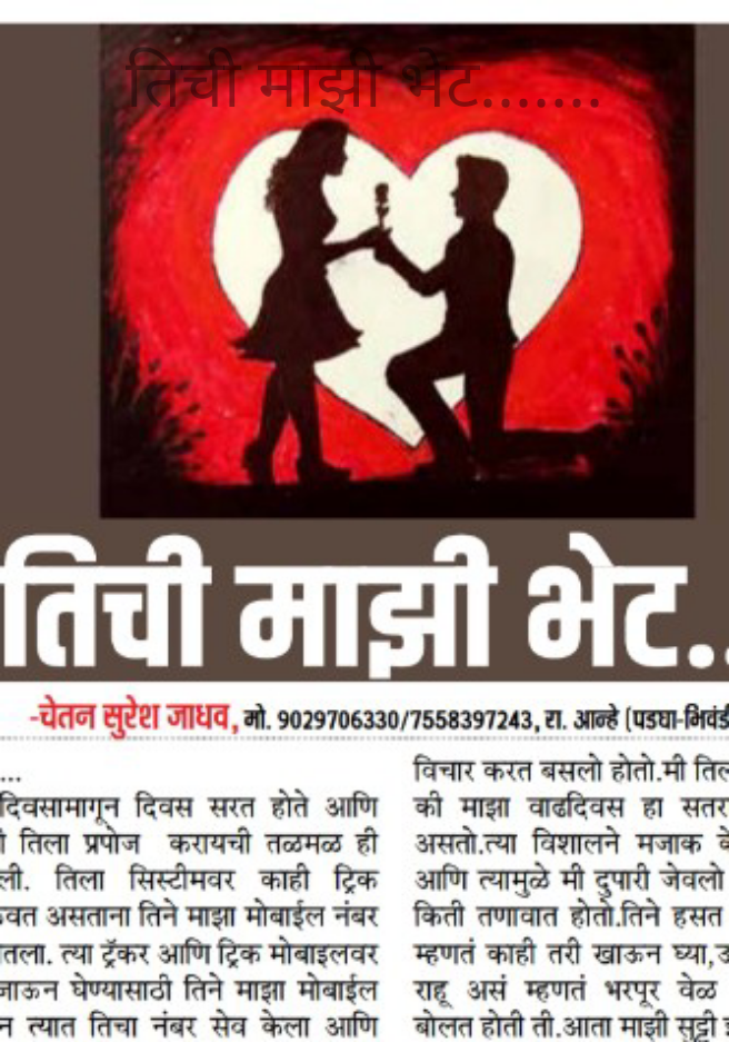 माझ्या आयुष्यातला मी कधीही न विसरणार तो दिवस 15 ऑगस्टचा होता.कंपनीत काम चालूच होते. स्वातंत्र्य दिन असल्या कारणाने कंपनीत कार्यक्रम आयोजित केला होता. त्याच दिवशी मी सकाळी तिला पाहिलं. पांढरा ड्रेस, ब्लु ओढणी परिधान केलेली ती दिसायला ही सुंदर होती.तिला पाहताक्षणी मी तिच्या प्रेमात पडलो.हे तिला लगेच सांगायचं कस? इतक्यात सांगणं योग्य होईल का? मी पूर्ण वेळ त्याचा विचारात होतो.इतक्यात कंपनीत स्पीकरद्वारे सांगण्यात आले की सर्वांनी डॉक नंबर तीन जवळ जमायचं आहे.सर्व कामगार आणि साहेब मंडळी तेथे जमली.अनेक कार्यक्रम सादर करण्यात आले.सहभागी सर्वाना काही गिफ्ट देण्यात आले.इतक्यात मागून मित्राने आवाज दिल अरे चेतन आज एक कविता होऊन जाऊदे.मी कविता लिहतो हे सर्वाना माहित होते. मग सर्वांच्या विनंतीला मान देऊन एक कविता सादर केली जी नुकत्याच झालेल्या पूर स्थितीवर आधारित होती. सर्वाना ती कविता आवडली.सर्वांनी टाळ्या शिट्या वाजवल्या कौतुक केलं. कविता म्हणताना सर्व समुदाय शांत ऐकत होता.त्या कवितेत पूरस्तिथीच्या भावना प्रत्येकाच्या मनाला भीडत होत्या.बक्षीस म्हणून एक कॅडबरी चॉकलेट मला देण्यात आले.आता ते चॉकलेट एकट्याने खाणे मला योग्य वाटल नाही म्हणून मी साऱ्या मित्रांना थोडं थोडं वाटलं.शेवटचा तुकडा बाकी होता आणि समोर तीच मुलगी उभी होती जिच्या मी प्रेमात पडलो होतो.आता काय कराव हिच्या सोबत बोलावंसं तर वाटतंय पण बोलायचं कस ? तिच्यासाठी तर मी अनोळखी.मग हातातल्या चॉकलेट वर नजर गेली आणि ते तिला देण्यासाठी पुढे झालो.मनात प्रश्न होताच ती बोलेल का? पण हिम्मत केली अन दिले तिला चॉकलेट.मी मनात खूप घाबरलो होतो कारण की या पूर्वी मी कधीच अनोळखी काय ओळखीच्या मुली सोबत सुद्धा कधी बोललो न्हवतो. समोरून तिचा गोड आवाज अभिनंदन म्हणून ऐकू आला. सोबतच तिला मी सादर केलेली कविता आवडली. हे ही ती ने सांगितले. मी खूप खूष झालो. ती माझ्याशी पहिल्यांदाच बोलली होती. तिचा स्वभाव शांत, संयमी छान होता.
