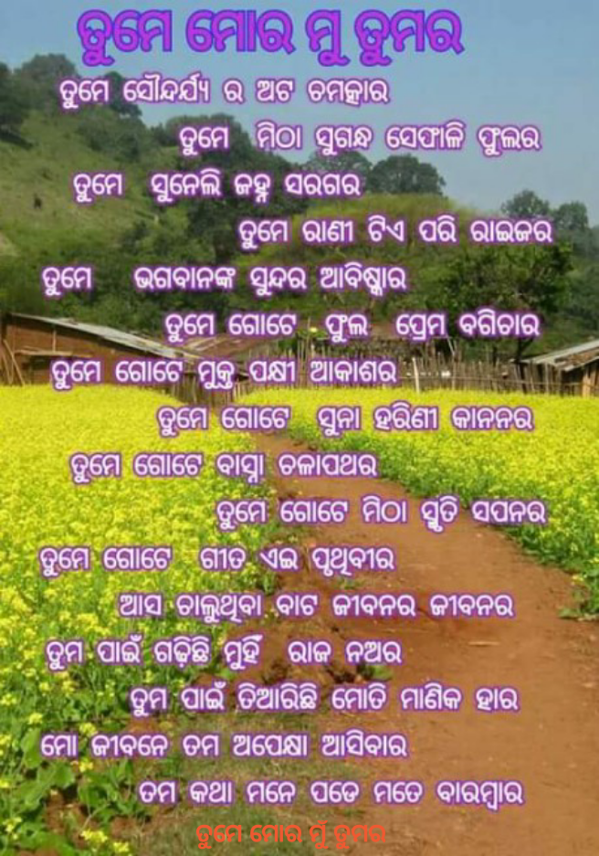 ତୁମେ ଚନ୍ଦ୍ରମା ହେଲେ ମୁଁ ପରା କଇଁ ତୁମେ କୃଷ୍ଣ ହେଲେ ମୁଁ ତୁମ ରାଇ। ତୁମେ ଚନ୍ଦ୍ରମା ହେଲେ ମୁଁ ପରା କଇଁ ତୁମେ କୃଷ୍ଣ ହେଲେ ମୁଁ ତୁମ ରାଇ।