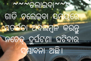 ~~~ଚଲାଇବା~~~ ଗାଡି ଚଲେଇବା ସମୟରେ ସତର୍କତା ଅବଲମ୍ବନ କରନ୍ତୁ ନଚେତ୍ ଦୁର୍ଘଟଣା ଘଟିବାର ସମ୍ଭାବନା ଅଛି।