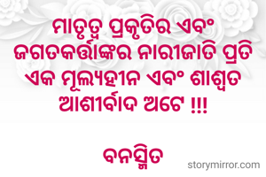 ମାତୃତ୍ୱ ପ୍ରକୃତିର ଏବଂ ଜଗତକର୍ତ୍ତାଙ୍କର ନାରୀଜାତି ପ୍ରତି ଏକ ମୂଲ୍ୟହୀନ ଏବଂ ଶାଶ୍ୱତ ଆଶୀର୍ବାଦ ଅଟେ !!! ବନସ୍ମିତ