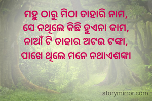 ମହୁ ଠାରୁ ମିଠା ତାହାରି ନାମ, ସେ ନଥିଲେ କିଛି ହୁଏନା କାମ, ନାଆଁ ଟି ତାହାର ଅଟଇ ଟଙ୍କା, ପାଖେ ଥିଲେ ମନେ ନଥାଏଶଙ୍କା