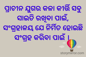 ପ୍ରାଚୀନ ଯୁଗର କଳା କୀର୍ତ୍ତି ସବୁ ସାଇତି ରଖିବା ପାଇଁ, ସଂଗ୍ରହାଳୟ ଯେ ନିର୍ମିତ ହୋଇଛି ସଂଗ୍ରହ କରିବା ପାଇଁ ।
