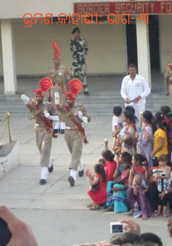 ଏହି ସେରମନି କରିବାର ମୂଳ ଉଦ୍ଦେଶ୍ୟ ହେଉଛି ରୀତି ଅନୁଯାୟୀ ସୀମାକୁ ରାତି ପାଇଁ ବନ୍ଦ କରିବା ଓ ଜାତୀୟ ପତାକାକୁ ତଳକୁ ଓହ୍ଲାଇ ଦେବା। ଷ୍ଟାଡିୟମରେ ପହଞ୍ଚିଲା ପରେ ମୋ ଭିତରେ ବହୁତ ଶକ୍ତି ଜାଗ୍ରତ ହେବାର ଅନୁଭବ କରିପାରୁଥିଲି ମୁଁ। ଭିଡ଼ ଥିବାରୁ ସମସ୍ତଙ୍କ ଠାରୁ ଅଲଗା ହୋଇଗଲି , କିନ୍ତୁ ବହୁତ ମଜା ଲାଗୁଥାଏ। ଆମ ଦେଶର ସୀମାରେଖା ଠାରେ ପହଁଚି ଥିବାରୁ ବହୁତ ଖୁସି ଅନୁଭବ କରୁଥିଲି ମୁଁ। ପ୍ୟାରେଡ ହେବ ବୋଲି ଉତ୍କଣ୍ଠାର ସହ ଅପେକ୍ଷା କରିଥିଲୁ। ହଠାତ୍ ବାଜାଶବ୍ଦ ଶୁଭିଲା। ଆମେ ଦର୍ଶକମାନେ ଉତ୍ସୁକତାର ସହ ଆଗକୁ ଅନାଇଲୁ। ପ୍ୟାରେଡ ଆରମ୍ଭ ହେଲା , ଦୁଇ ଦେଶର ସୈନିକ ମାନେ ବହୁତ ଜୋରରେ ଚିଲ୍ଲେଇ , ଶବ୍ଦକରି ଡ୍ରିଲ୍ କରୁଥାନ୍ତି ଯେପରିକି ଯୁଦ୍ଧାଭ୍ୟାସ କରୁଛନ୍ତି !!! ତା' ସଙ୍ଗେ ପୁଣି ଗୋଡ଼କୁ ଯେତେ ସମ୍ଭବ ଉଚ୍ଚକୁ ଟେକି ହେଇପାରିବ , ସେତିକି ଉଚ୍ଚକୁ ଟେକୁଥାନ୍ତି। ଦେଶାତ୍ମବୋଧକ ଗୀତସବୁ ବାଜୁଥାଏ , ସେଇ ତାଳେ ତାଳେ ନାଚ ଆଦି ହେଉଥାଏ। ହିନ୍ଦୀ ସିନେମାର ଦେଶାତ୍ମବୋଧକ ଗୀତ ସବୁ ବି ବାଜୁଥାଏ। ସେମାନଙ୍କ ସାଙ୍ଗରେ ଦର୍ଶକମାନେ ମଧ୍ୟ ବିଭୋର ହୋଇ ନାଚୁଥାନ୍ତି। ଶେଷରେ ଦୁଇଦେଶର ଜାତୀୟ ପତାକା ଏକସଙ୍ଗେ ତଳକୁ ଖସାଇ ଦେଲାପରେ ସେରମନି ଶେଷ ହେଲା।ସେତେବେଳେ ମୁଁ ମୋ ପରିବାର ଲୋକଙ୍କୁ ଖୋଜିଲି। ଦେଖିଲି , ସେମାନେ ବିପରୀତ ଦିଗରୁ ହାତ ହଲାଉଛନ୍ତି। ଆମେସବୁ ମିଶି ସୀମା ନିକଟରେ କିଛି ଫଟୋ ଉଠାଇ ଫେରିଲୁ ଓ ହୋଟେଲ୍ ରେ ଆସି ଖାଇ ବିଶ୍ରାମ ନେଲୁ।