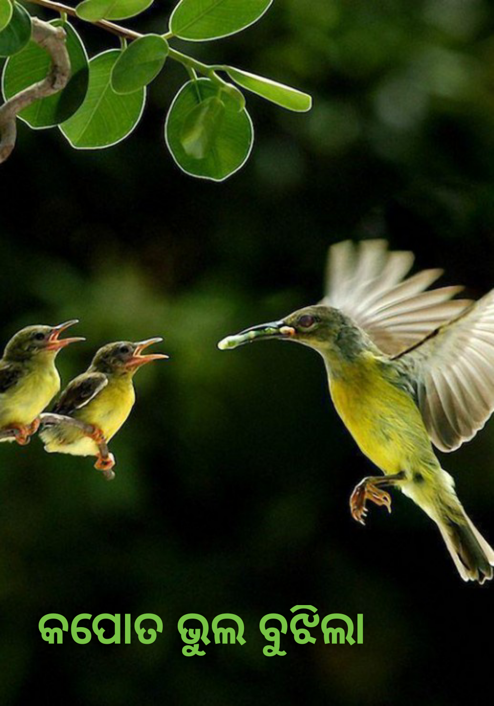ଦିନେ ସକାଳୁ ସକାଳୁ ବର୍ଷା ଲାଗି ରହିଲା । କପାେତର ଦେହ ଭଲ ଲାଗିଲା ନାହିଁ । ତେଣୁ ସେ ଦିନ କପାେତୀ ଏକା ଆହାର ଖାେଜିବାକୁ ଗଲା ।କିନ୍ତୁ; ସଂଧ୍ୟା ପର୍ଯ୍ୟନ୍ତ ସିଏ ବସାକୁ ଫେରିଲା ନାହିଁ । କପାେତୀର ବାଟକୁ ଚାହିଁ ରହିଥାଏ କପାେତ ବେଳକୁ ବେଳ ତାକୁ ବହୁତ ଚିନ୍ତା ଲାଗୁଥାଏ । ତହିଁକେ ବରଷା ରାତି । କପାେତୀ ଗଲା କୁଆଡେ ? ଏ ପର୍ଯ୍ୟନ୍ତ ଆସିଲା ନାହିଁ । ବର୍ଷା ତ ଅନେକ ବେଳୁ ଛାଡି ଗଲାଣି । ସଂଧ୍ୟା ଗଡି ରାତି ହେଲାଣି ।ହେଲେ କପାେତୀର ଦେଖା ନାହିଁ । କପାେତ କିଛି ଭାବି ପାରୁ ନ ଥିଲା । ସକାଳ ପାହିଲା । କପାେତୀ ବସାକୁ ଫେରିଲା । କପାେତୀକୁ ଦେଖି କପାେତ ଖୁବ୍ ରାଗିଗଲା । ବହୁତ ଗାଳିମନ୍ଦ କଲା । କପାେତୀ କିଚଵି କହିଲା ନହିଁ । ସ୍ବାମୀର ରାଗକୁ ମଥାପାତି ସହିଗଲା । କପାେତୀ କିଛି କହିବାକୁ ଚାହୁଁଥିଲା ହେଲେ କପାେତୀର କାୈଣସି କଥାକୁ ଶୁଣିବାକୁ କପାେତର ଧୈର୍ଯ୍ୟ ନଥିଲା । ରାଗରେ କପାେତୀକୁ ତଡି ଦେଲା ବସାରୁ । ବିଚାରୀ କପାେତୀ କାନ୍ଦି କାନ୍ଦି ବସା ଛାଡି ଚାଲିଗଲା । ଅନ୍ୟ ଏକ ଗଛରେ ଆଶ୍ରୟ ନେଲା । ଏଣେ ଛାେଟ ଛୁଆଟି ମାଆକୁ ପାଖରେ ନ ପାଇ ବିକଳରେ କାନ୍ଦିବାକୁ ଲାଗିଲା । କପାେତର ବୁଦ୍ଧି ବଣା ହାେଇଗଲା । ଛୁଆଟିକୁ ଲାଳନ ପାଳନ କରିବାରେ ତାକୁ ବହୁତ କଷ୍ଟ ହେଲା । ଦିନେ ଛୁଆଟିର ଦେହ ହଠାତ୍ ଖରାପ ହେଲା । ଏକାଥରକୁ ଖାଇବା ପିଇବା ଛାଡି ଦେଲା । ଖାଦ୍ୟ ଆଣିବାକୁ ନ ଗଲେ ଭାେକରେ ରହିବାକୁ ପଡିବ । କ'ଣ କରିବ ସେ କିଛି ବୁଝି ପାରିଲା ନାହିଁ । ବାଧ୍ୟ ହାେଇ ବସାରେ ଛୁଆକୁ ଏକା ଛାଡି ଆହାର ଖାେଜିବାକୁ ଗଲା । ପାଖ ଗଛରୁ ଥାଇ ଏ କଥା କପାେତୀ ସବୁ ଦେଖୁଥିଲା ବସା ଛାଡି କପାେତ ଗଲାପରେ କପାେତୀ ଅତି ସନ୍ତର୍ପଣରେ ଆସି ତା' ଛୁଆକୁ ଥରେ ଆଖି ପୂରେଇ ଦେଖିଲା । ଖୁସିରେ ଦେହସାରା ଥଣ୍ଟରେ ଘଷିବାକୁ ଲାଗିଲା । କିଛି ସମୟ ଗେଲ କଲା । କପାେତ ବସାକୁ ଫେରି ଆସିବା ପୂର୍ବରୁ ବସା ଛାଡି ଚାଲିଗଲା । ଏମିତି କପାେତ ବସାରେ ନ ଥିବା ବେଳେ କପାେତୀ ଯାଆ ଆସ କରେ । କପାେତ ଆସି ଦେଖିଲା, ଛୁଆଟି ପୂରାପୂରି ଭଲ ହୋଇ ଯାଇଛି । ମନ ଖୁସିିରେ ଖେଳୁଛି କପାେତ ଦେଖି ଆଶ୍ଚର୍ଯ୍ୟ ହାେଇଗଲା । ସେଇ ଗଛରେ ବସା ବାନ୍ଧି ରହୁଥିବା ବାଇଚଢେଇଟି କପାେତ ପାଖକୁ ଆସି କହିଲା:" କପାେତ ଭାଇ ! ତୁମେ ବସାରେ ନ ଥିବା ବେଳେ କପାେତୀ ସବୁଦିନ ଏଠାକୁ ଆସେ । ତା' ଛୁଆକୁ ଥରେ ଆଖି ପୂରେଇ ଦେଖି ଚାଲିଯାଏ । ତା' ପାଇଁ ବାେଲି ଛୁଆଟିର ଦେହ ଭଲ ହାେଇଛି । ତୁମେ ତାକୁ ଭୁଲ୍ ବୁଝିଲ ସିନା ।ହେଲେ ବିଚାରୀର କିଛି ଦାେଷ ନାହିଁ । ମାଆକୁ ଛାଡି କ'ଣ କେବେ ଛୁଆ ରହିପାରେ ? ମାଆ ବି କ'ଣ ତା' ଛୁଆକୁ ଛାଡି କେବେ ଏକା ରହି ପାରିବ ? ତୁମେ ତା'ର ଯେତେ ସେବା ଯତ୍ନ କଲେ ମଧ୍ୟ ଗାେଟିଏ ପୁଅ ପାଇଁ ମାଆଟିଏ ନିହାତି ଦରକାର । ତୁମେ ଯାଇ କପାେତୀକୁ ବୁଝାଇ ଶୁଝାଇ ନେଇ ଆସ ବସାକୁ ।" କପାେତ ଶେଷରେ ନିଜ ଭୁଲ୍ ବୁଝି ପାରିଲା । ମାଆ ବିନା ଛୁଆଟିକୁ ପାଳିବା କେତେ ଯେ କଷ୍ଟକର ସେ କଥା ସିଏ ଜାଣି ପାରିଲା । କପାେତ ଯାଇ କପାେତୀକୁ ବୁଝାଇ ଶୁଝାଇ ଡାକି ଆଣିଲା । ପୁଣି ଥରେ ତାଙ୍କ ପରିବାର ଖୁସିରେ ହସି ଉଠିଲା ।