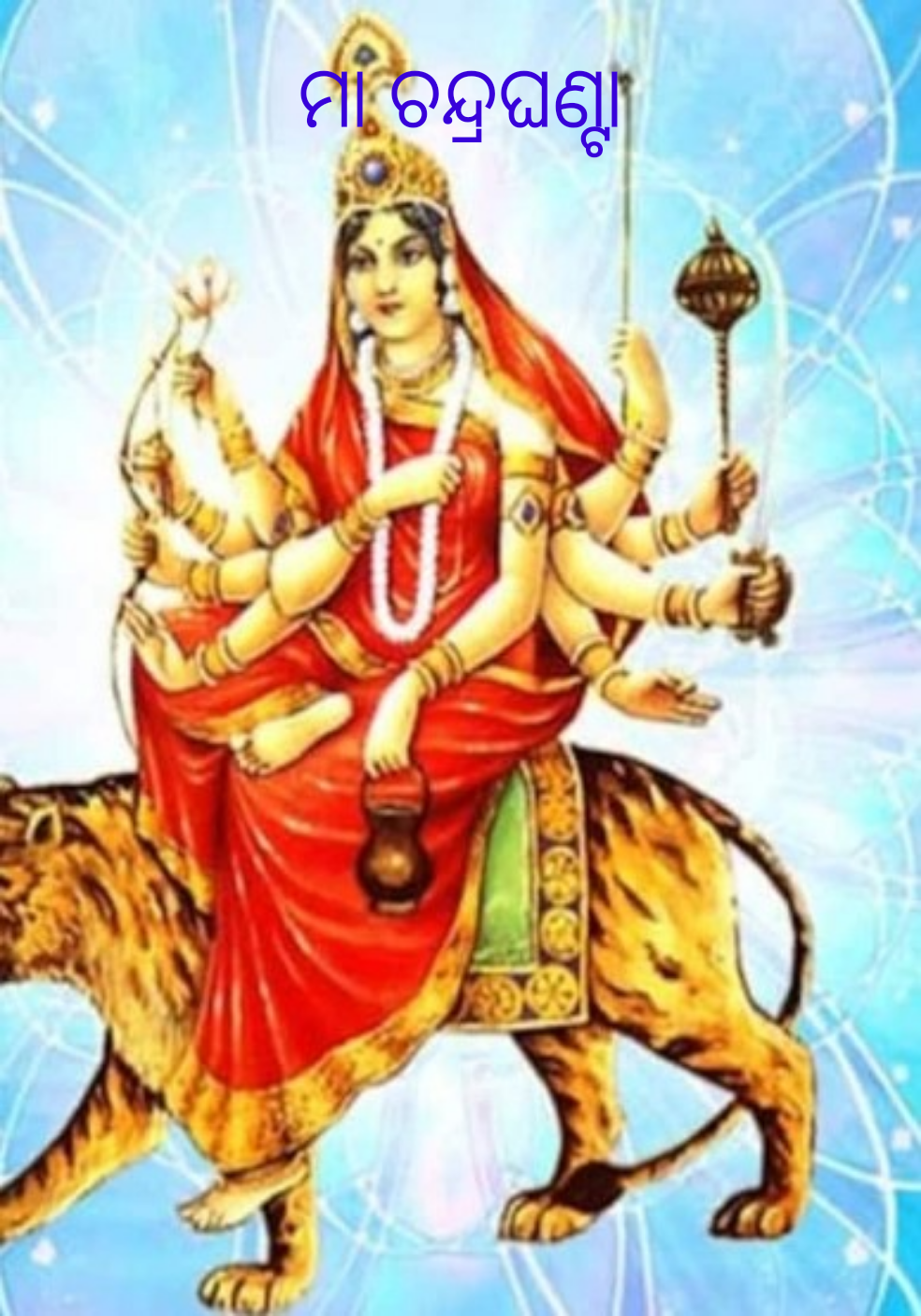 ନବରାତ୍ରର ତୃତୀୟ ଦିବସରେ କଲ୍ୟାଣ ମୟୀ ଜଗତ ଜନନୀ ମା' ଚନ୍ଦ୍ରଘଣ୍ଟା ରୂପରେ ପୂଜା ପାଇଥାନ୍ତି।ପୌରାଣିକ କଥା ଅଛି ଯେ' ମା' ଚନ୍ଦ୍ରଘଣ୍ଟାଙ୍କ ଘଣ୍ଟ ଧ୍ୱନିରେ ଅତ୍ୟାଚାରୀ, ଦାନବ, ଦୈତ୍ୟ ସବୁ ଭୟଭୀତ ହୁଅନ୍ତି।ମସ୍ତକରେ ମା' ଅର୍ଦ୍ଧ ଚନ୍ଦ୍ର ଧାରଣ କରନ୍ତି ଏବଂ ସିଂହ ବାହନରେ ବିରାଜମାନ କରିଥାନ୍ତି।ଏହି ସ୍ୱରୂପରେ ମା' ଙ୍କ ମସ୍ତକରେ ଘଣ୍ଟା ଆକାରର ଅର୍ଦ୍ଧ ଚନ୍ଦ୍ର ଥିବାରୁ ତାଙ୍କୁ ମା' ଚନ୍ଦ୍ରଘଣ୍ଟା ବୋଲି କୁହାଯାଏ।