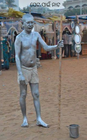 ମତେ ମଞ୍ଚରେ ଅଭିନୟ କରିବାକୁ ଭାରି ଭଲଲାଗେ। ଜଣେ କଳାକାର ଭାବେ କେତେବେଳେ କେଉଁ ଅଭିନୟ କରିଥାଏ । ସେଠୁ କିଛି ପଇସା ମିଳିଯାଏ। ମୋ ସଂସାର ଚାଲେ। କିନ୍ତୁ ଏ କରୋନା ଲାଗି ମୁଁ ସବୁ ଜୀବିକା ହରାଇ ବସିଛି। ଆଉ କେତେଦିନ ପେଟରେ ଓଦାକନା ପକାଇ ଶୋଇବି ! ଭାବିଲି ଜଣେ ସ୍ବାଧୀନତା ସଂଗ୍ରାମୀର ଅଭିନୟ କରିବି। ଶେଷରେ ନିଜକୁ ମହାତ୍ମାଗାନ୍ଧୀ ବେଶରେ ସମୁଦ୍ର କୂଳରେ ଛିଡା ହୋଇ ଜୀବିକା ଉପାର୍ଜନ କରୁଛି।