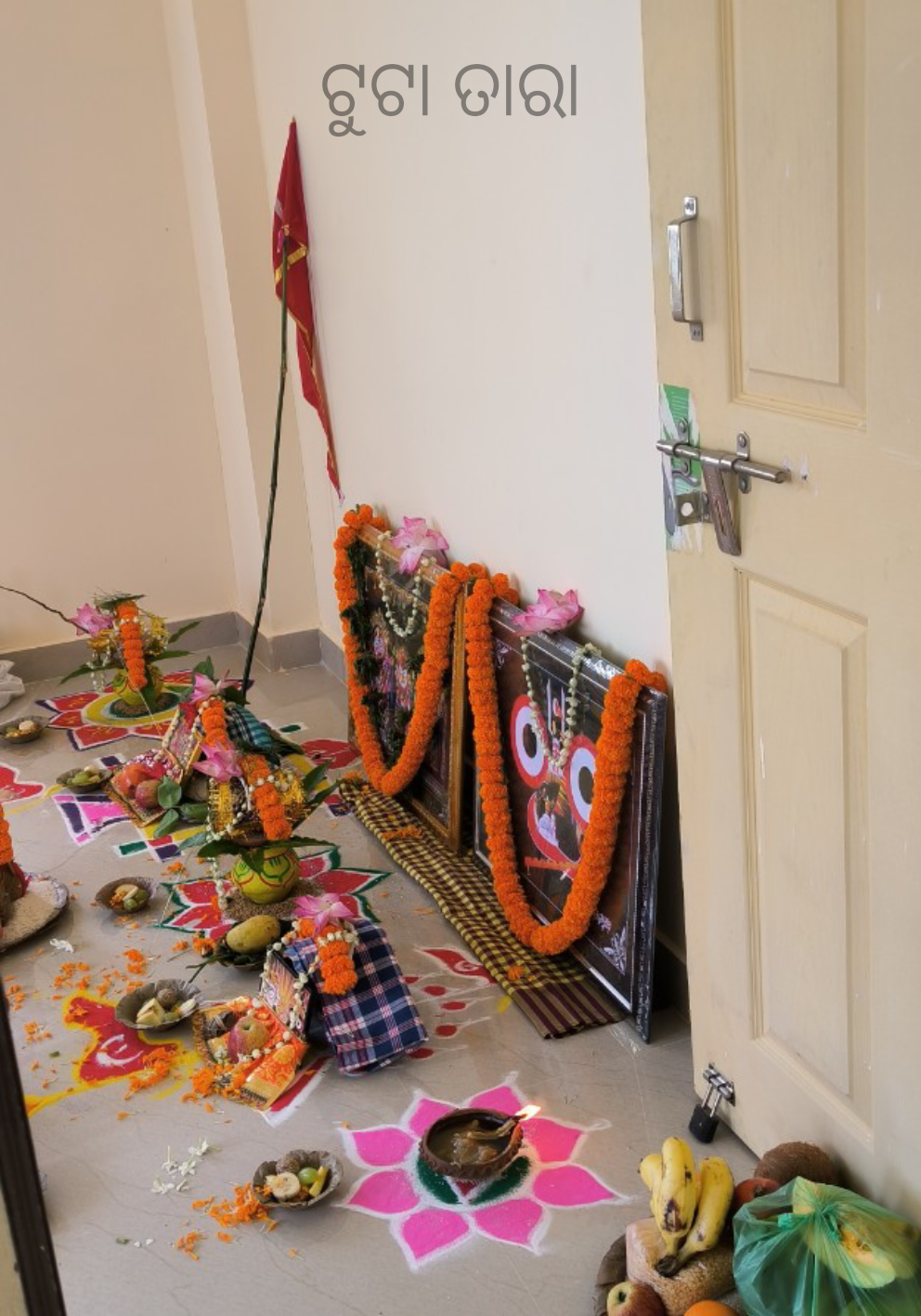 ହଠାତ ଦେଖାଗଲା ଟୁଟା ତାରା ଖସିପଡ଼ୁଛନ୍ତି ଆକାଶରୁ ପୃଥିବୀ ପୃଷ୍ଠ ଆଡକୁ. ମତେ ଲାଗୁଥିଲା ପ୍ରତିଟି ଟୁଟା ତାରା ଭିତରେ ଆକାଶରୁ, ଜଗନ୍ନାଥ,ବଳଭଦ୍ର ଓ ସୁଭଦ୍ରା ଖସିପଡ଼ୁଛନ୍ତି ପାରାଚୁଟ ଦୋଳିରେ. ଶେଷକୁ ଗୋଟେ ଟୁଟା ତାରା ସହ ସୁଦର୍ଶନ ଚକ୍ର ଖସିପଡୁଥିବା ଦେଖି ବିଭୋର ହୋଇ ତଳକୁ ଚାହେଁ ତ ରଥଯାତ୍ରା ପ୍ରସ୍ତୁତି ପ୍ରାୟ. ମୁଣ୍ଡଟା ଟିକେ ଭଲ ଲାଗୁଥିଲା. ପ୍ରଭୁଙ୍କ କରୁଣା ଭାବି ତଳକୁ ଆସି ଶାନ୍ତିରେ ଶୋଇଗଲା ପରେ ମଧ୍ୟ ଜଗନ୍ନାଥ ମନ ମୁନ ଚୈତନ୍ୟ ଭିତରେ ଆବୋରି ବସିଥିଲେ ଭାବାବେଗରେ. ଏବର୍ଷ ରଥ ଦଉଡି ଭିଡିବାକୁ ନିଜକୁ ପ୍ରସ୍ତୁତ କରୁଥିଲି ମୁଁ ।