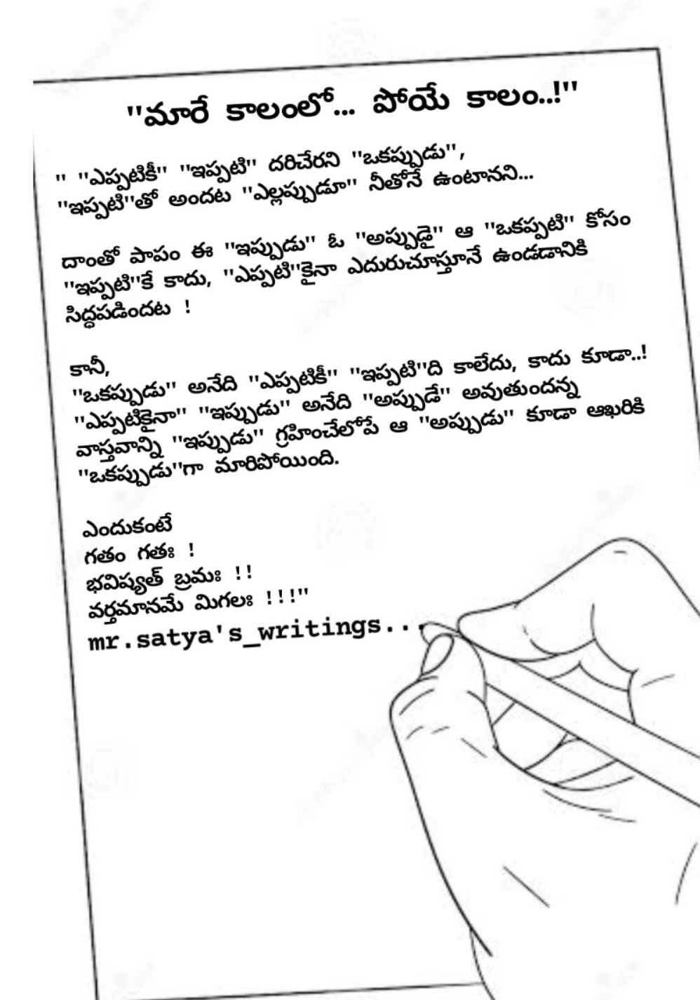 "ఎప్పటికైనా" "ఇప్పుడు" అనేది "అప్పుడే" అవుతుందన్న వాస్తవాన్ని "ఇప్పుడు" గ్రహించేలోపే ఆ "అప్పుడు" కూడా ఆఖరికి "ఒకప్పుడు"గా మారిపోయింది.