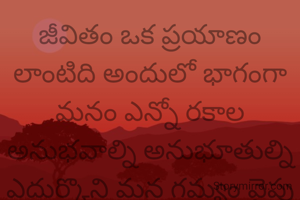 జీవితం ఒక ప్రయాణం లాంటిది అందులో భాగంగా మనం ఎన్నో రకాల అనుభవాల్ని అనుభూతుల్ని ఎదుర్కొని మన గమ్యం వైపు సాగాలి అనుకుని తగినంత కృషి చేయాలని మన పెద్దలు అంటారు,ఆ మాట ముమ్మాటికీ నిజం