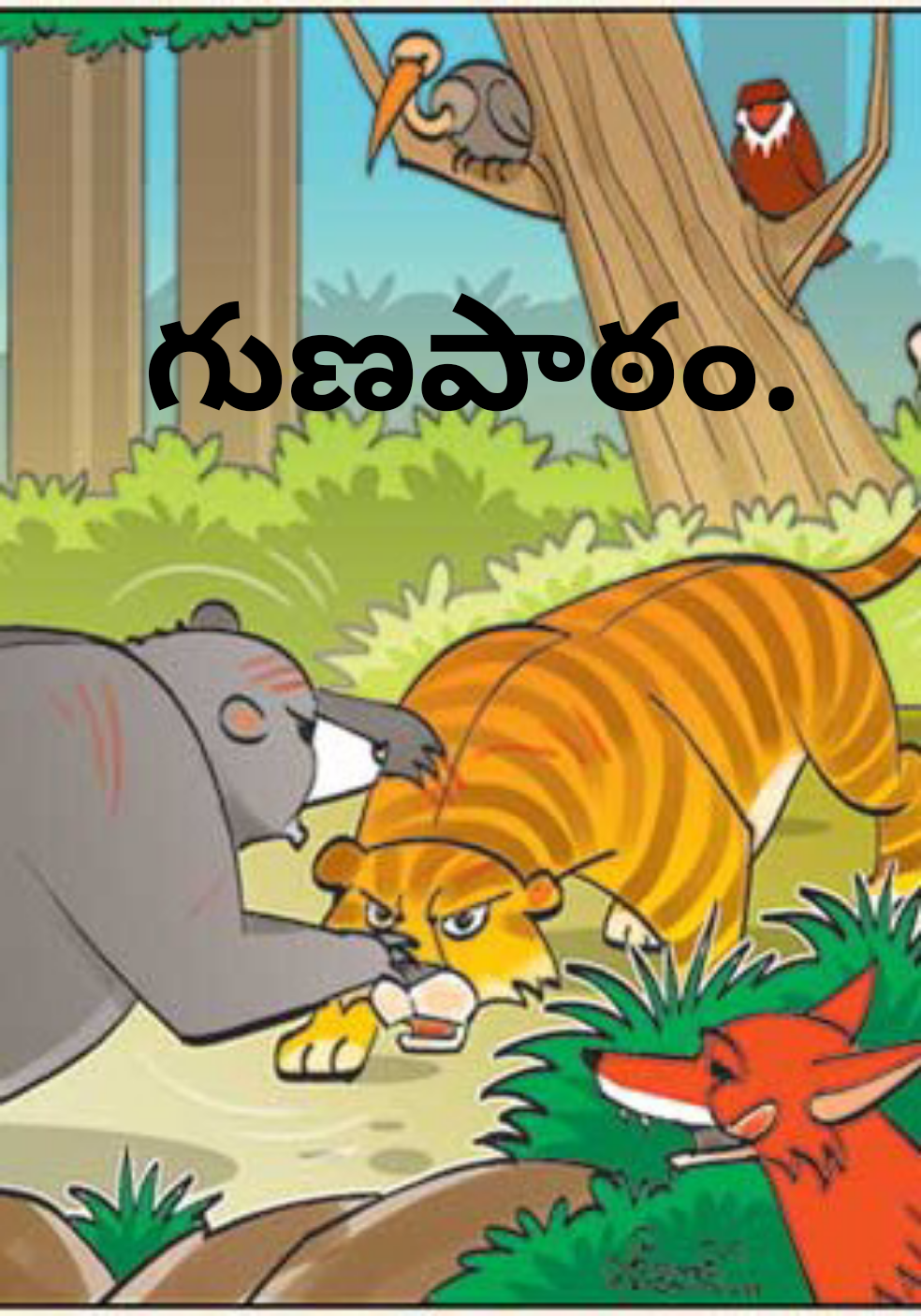 పోట్లాడు" అని చెప్పింది. "ఆ సరే రా!"అంటూ ఎలుగుబంటి ఈగ మీదకు ఒక్క సారిగా దూసుకెళ్లింది. ఈగ తన తెలివితో ఎలుగుబంటి ముక్కులోకి, చెవిలోకి, దూరి నానా తిప్పలు పెట్టింది. దెబ్బకు ఎలుగుబంటి బాధ భరించలేక వెళ్ళిపోయింది. పులి కిందకు దిగింది. "మిత్రమా! నన్ను క్షమించు. నిన్ను వెక్కిరించాను. ఆకారంలో చిన్నదాని వైనా తెలివితో మమ్మల్ని కాపాడావు. "కండ బలము కన్నా బుద్ధి బలము గొప్పది"అనే గుణపాఠాన్ని నేర్పావు" అని చెప్పింది. ఈగ ఏమీ మనసులో పెట్టుకోకుండా పులిని క్షమించింది. తర్వాత ముగ్గురు కలిసి సర్కస్ కి వెళ్లి ఆనందంగా గడిపారు.