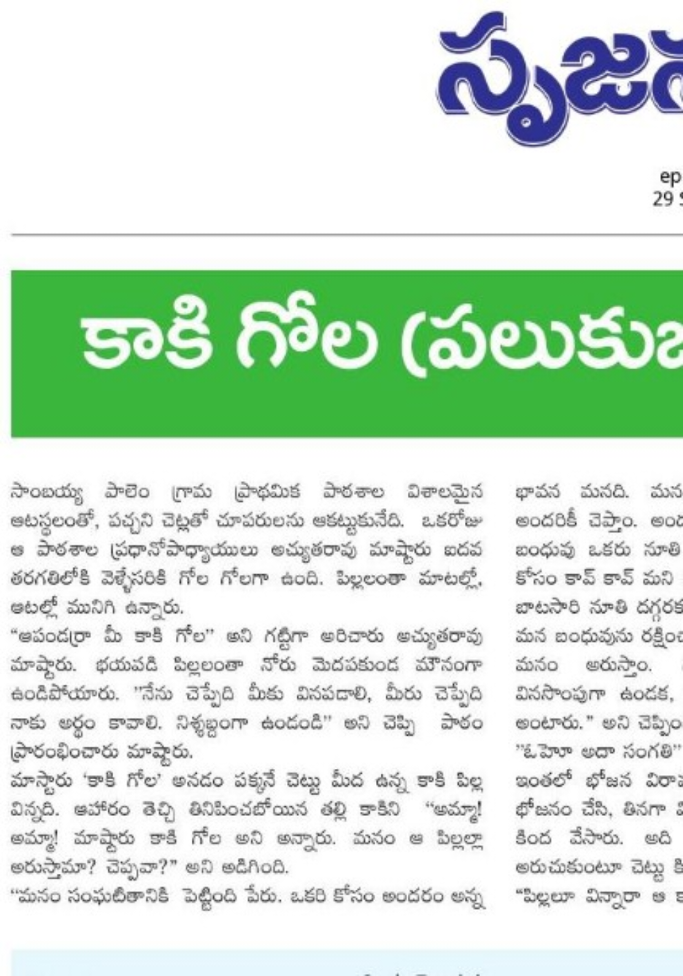 మాస్టారు 'కాకి గోల' అనడం పక్కనే చెట్టు మీద ఉన్న కాకి పిల్ల విన్నది. ఆహారం తెచ్చి తినిపించబోయిన తల్లి కాకిని "అమ్మా! అమ్మా! మాష్టారు కాకి గోల అని అన్నారు. మనం ఆ పిల్లల్లా అరుస్తామా? చెప్పవా?” అని అడిగింది.