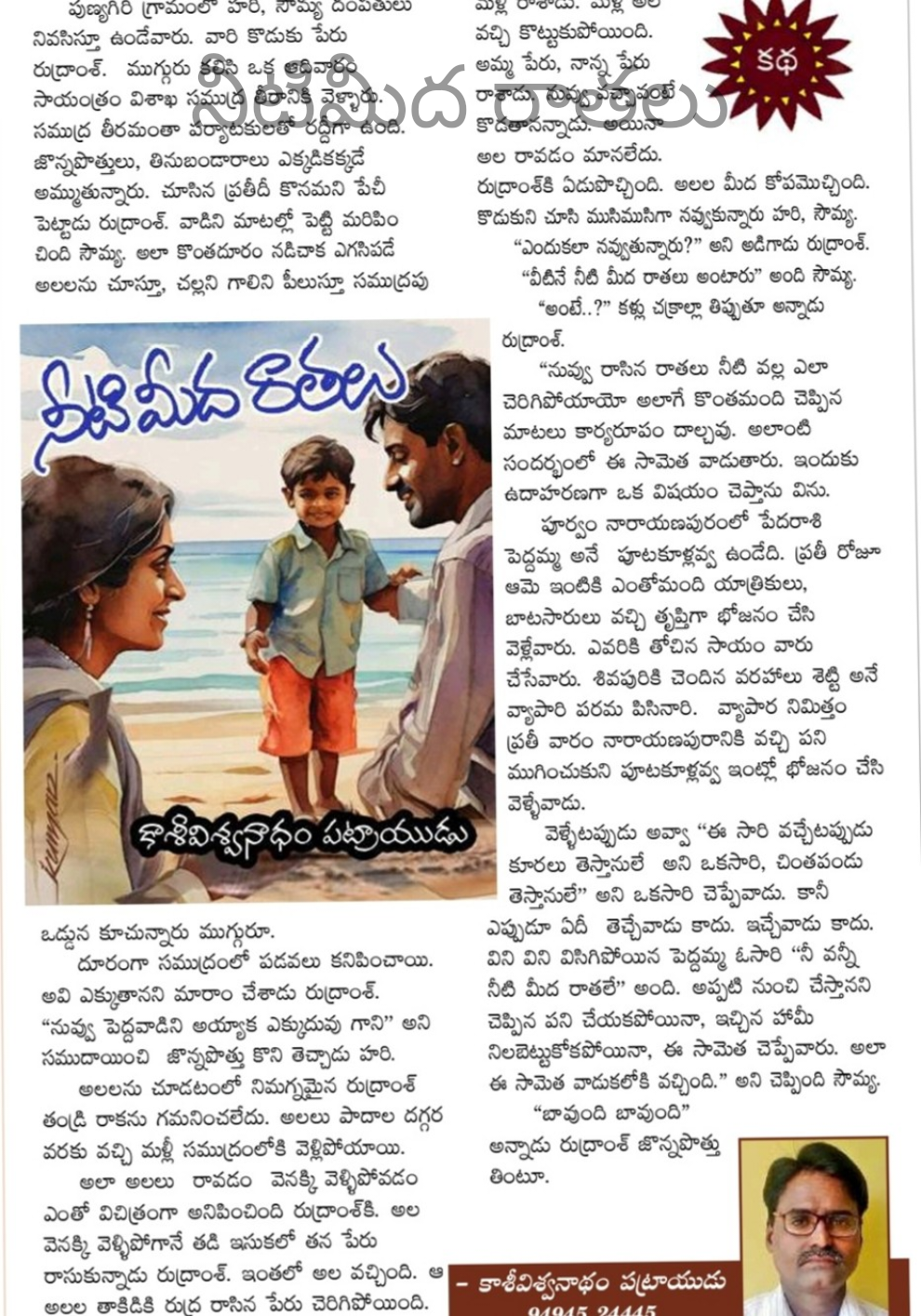 ఎగసిపడే అలలను చూస్తూ, చల్లని గాలిని పీలుస్తూ సముద్రపు ఒడ్డున కూచున్నారు ముగ్గురూ. దూరంగా సముద్రం లో పడవలు కనిపించాయి. అవి ఎక్కుతానని మారాం చేశాడు రుద్రాంశ్. "నువ్వు పెద్దవాడిని అయ్యాక ఎక్కుదువు గాని" అని సముదాయించి జొన్నపొత్తు కొని తెచ్చాడు హరి. అలలను చూడటంలో నిమగ్నమైన రుద్రాంశ్ తండ్రి రాకను గమనించలేదు. అలలు పాదాల దగ్గర వరకు వచ్చి మళ్లీ సముద్రం లోకి వెళ్లి పోయాయి. అలా అలలు రావడం వెనక్కి వెళ్ళిపోవడం ఎంతో విచిత్రంగా అనిపించింది రుద్రాంశ్ కి.. అల వెనక్కి వెళ్ళిపోగానే తడి ఇసుకలో తన పేరు రాసుకున్నాడు రుద్రాంశ్. ఇంతలో అల వచ్చింది. ఆ అలల తాకిడికి రుద్ర రాసిన పేరు చెరిగిపోయింది. మళ్లీ రాశాడు. మళ్లీ అల వచ్చి కొట్టుకుపోయింది. అమ్మ పేరు, నాన్న పేరు రాశాడు. నువ్వు వచ్చావంటే కొడతానన్నాడు. అయినా అల రావడం మానలేదు. రుద్రాంశ్ కి ఏడుపొచ్చింది. అలల మీద కోపమొచ్చింది. కొడుకుని చూసి ముసిముసిగా నవ్వుకున్నారు హరి, సౌమ్య.
