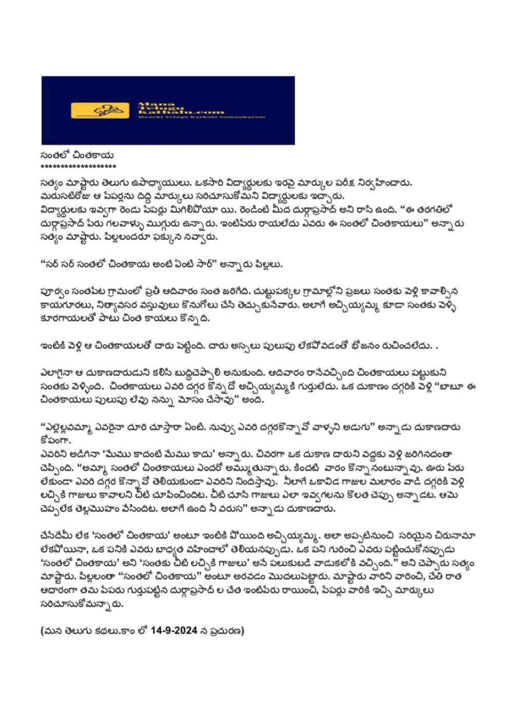 విద్యార్థులకు ఇవ్వగా రెండు పేపర్లు మిగిలిపోయా యి. రెండింటి మీద దుర్గాప్రసాద్ అని రాసి ఉంది. “ఈ తరగతిలో దుర్గాప్రసాద్ పేరు గలవాళ్ళు ముగ్గురు ఉన్నారు. ఇంటిపేరు రాయలేదు ఎవరు ఈ సంతలో చింతకాయలు” అన్నారు సత్యం మాష్టారు. పిల్లలందరూ ఫక్కున నవ్వారు.